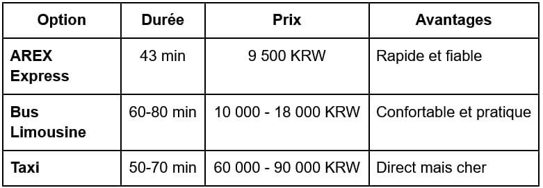 Le train AREX est une excellente option pour rejoindre la capitale. Vous avez le choix entre deux services. L'Express vous emmène directement à Séoul en seulement 43 minutes. C'est rapide et efficace !